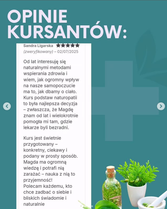 Nazywam się Magdalena i od lat zajmuję się naturopatią a dokładnie terapiami przyczynowo-skutkowymi, których celem nie jest maskowanie objawów, lecz docieranie do realnej przyczyny problemów zdrowotnych.